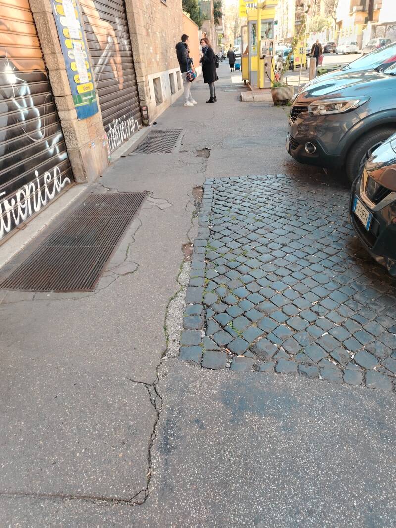 Un esempio significativo è rappresentato da Circonvallazione Appia, dove il manto dei marciapiedi risulta irregolare in diversi tratti. Qui si alternano superfici asfaltate e tratti in sampietrini, creando ulteriori disagi. Inoltre, nel punto tra via Muzio Scevola e via Camilla, sebbene sia presente un abbassamento utile per facilitare la discesa, subito dopo si incontra una piccola fossa che rende impossibile il passaggio autonomo per una persona in carrozzina.